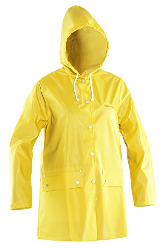 Womens jacket with adjustable hood and duuble-buttoned storm flap. Wedge in the back, front pockets and adjustable sleeve ends. A-lined shape. Made from PVC coated polyester. Total weight 330 g/m. Although this garment is designed and developed for Outdoor, it works excellent for other purposes that demand rugged and one hundred percent waterproof rainwear of the highest quality.