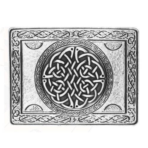 Wallace Rectangular Celtic Knot Kilt Belt Buckle This beautiful Belt Buckle has been cast in Glasgow from the finest quality lead free pewter and plated in Antique Silver This would make an ideal gift as comes in a lovely presentation gift box Measures 10cm x 7.5cm approx Will Fit most kilt belts upto 2.5" Made In Scotland